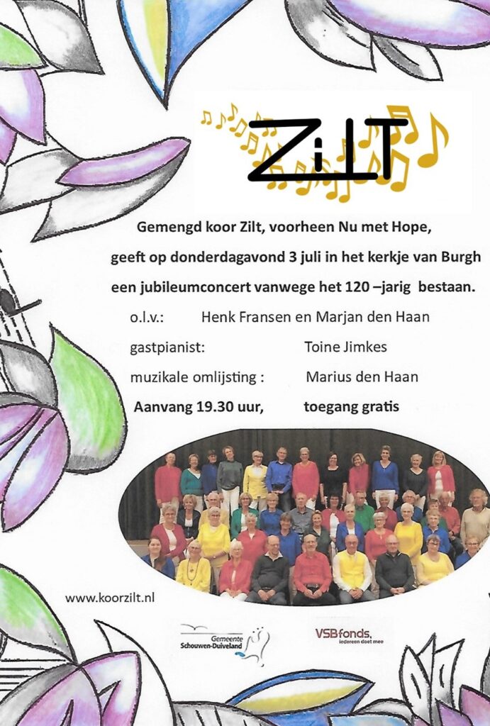 Koor Zilt bestaat op 21 oktober 2025 precies 120 jaar. Om deze muzikale mijlpaal te vieren geven wij op donderdag 3 juli 2025 om 19.30 uur een feestelijk jubileumconcert in de kerk van Burgh. Iedereen die dit met ons mee wil vieren is van harte welkom.